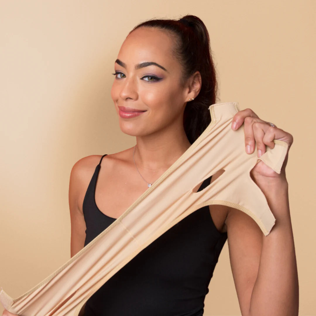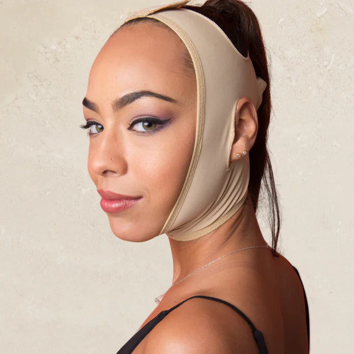 - Grâce à une pression ciblée, la gaine sculpte les volumes en limitant leur expansion, tout en rehaussant le menton pour un effet lift naturel.